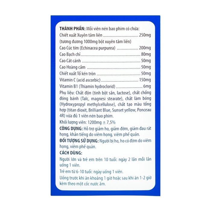 - Chiết xuất Xuyên tâm liên: 250mg (tương đương 1000mg bột xuyên tâm liên)
